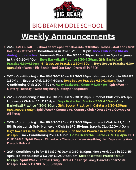 Weekly Announcements & Late Start Reminder!
